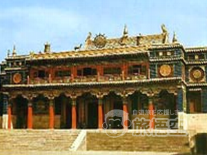 牌楼から本堂までが中軸線で、5つの院落からなっています。本堂はチベット様式で、四面の壁に彩色の琉璃磚を使い、屋根に金銅製の宝瓶、法輪、飛竜、祥鹿を配し、赤い出入口や扉の彩色画とあいまって、目を奪わんばかりの絢燗さで、古典建築の傑作。 本堂の前に高さ約15mの色鮮やかなチベット式のラマ塔が建っています。内蒙古現存最大のラマ塔で、完璧に近い造形美を誇ります。