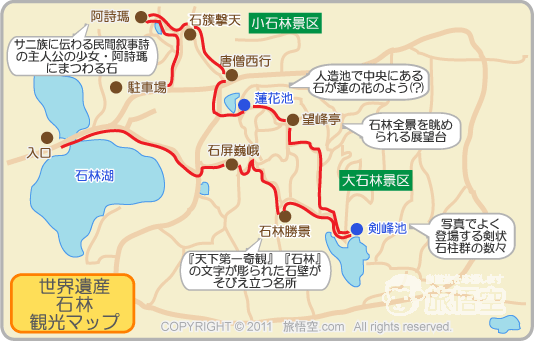 ※入口→石屏巍峨→石林勝景→剣峰池→望峰亭→蓮花池→唐僧西行→石簇撃天→阿詩瑪